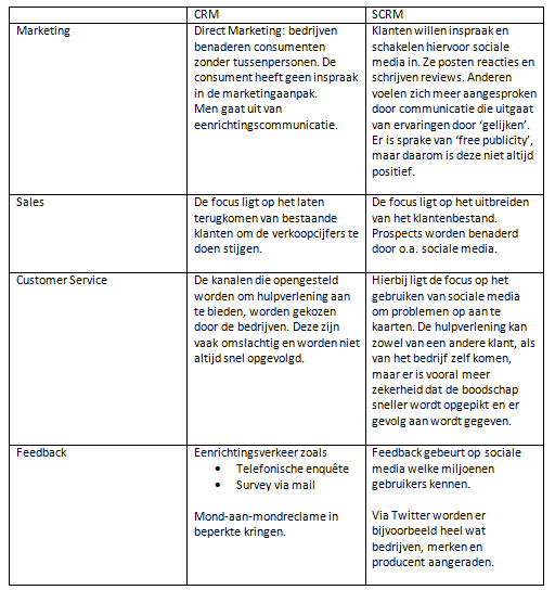 Beschrijf in eigen bewoordingen wat bovenstaande infografiek wil duidelijk maken. In welke mate verschilt 'traditionele CRM' van 'SCRM' indien we kijken naar de domeinen van Marketing, Sales, Customer Service en Feedback. Denk ook eens na over wat dit betekent voor de organisatie van een kmo.